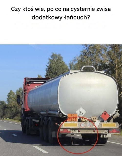 Dodatkowy łańcuch zwisający z tyłu cysterny pełni funkcję uziemienia . Jego najważniejszą funkcją jest bezpieczne usuwanie ładunków elektrostatycznych , które mogą gromadzić się podczas transportu łatwopalnych cieczy. Podczas jazdy cysterny następuje duży ruch. Rozbryzgi cieczy wewnątrz cysterny powodują tarcie o jej ściany, a sama cysterna jest w ciągłym ruchu, generując coraz większe tarcie z powietrzem i drogą. Oba te zjawiska mogą generować znaczną ilość ładunków elektrostatycznych.